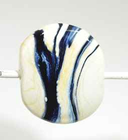 For this bead, I make an ivory bead, put very thin trails of Oracle-Black on it, and then cooked the snot out of it. As you can see - this did not strike in the kiln, but I really did put it on very thin. I rather like the effect. It hasn't really webbed up, like the old intense black used to do, but there is a little something going on. But, like I said, I really tortured it here. And I like it.
