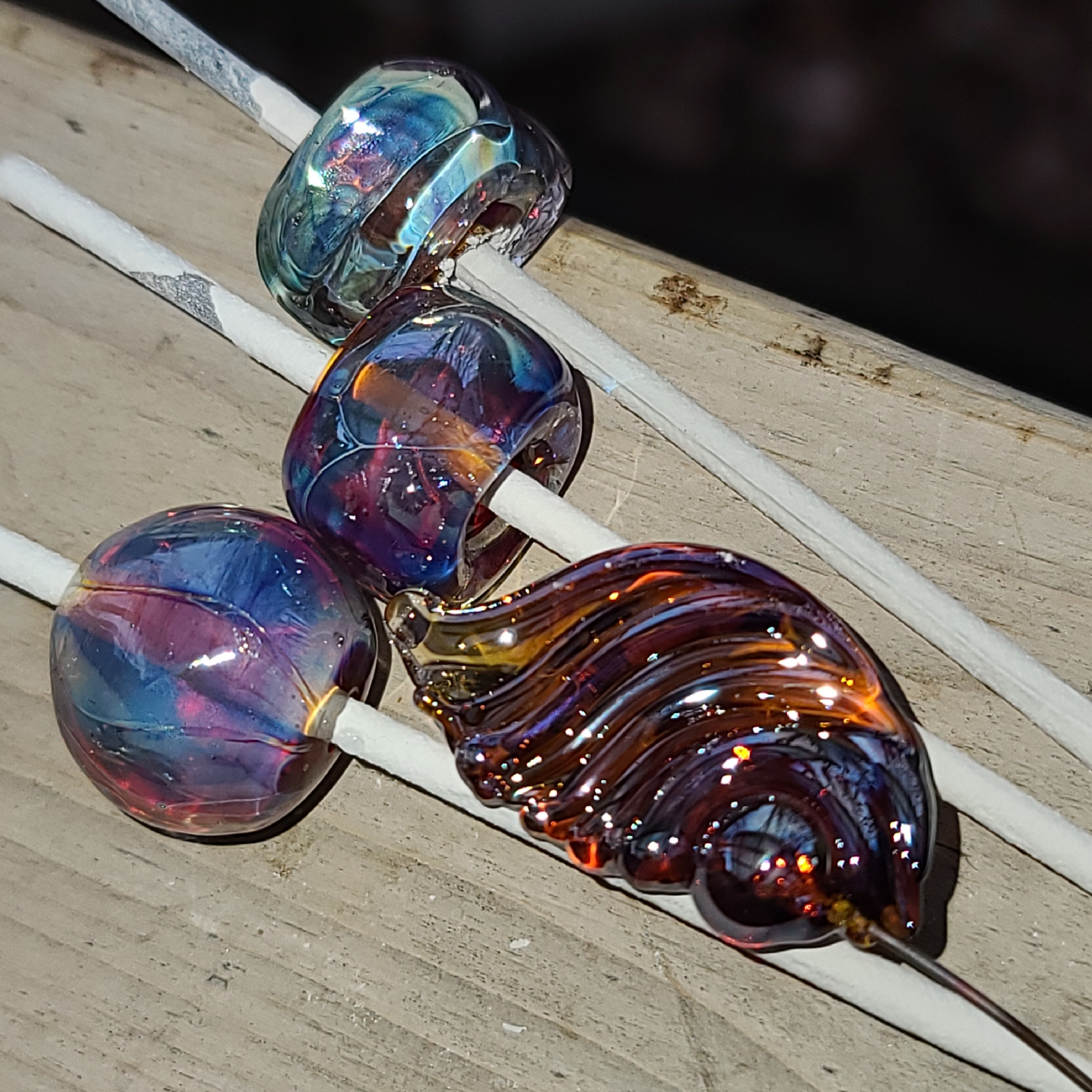 Overall, really nice to work with. The barrel bead is dark ivory with onyx and melted in until it webs. The tablet bead starts as a base bead of white, with three horizontal stripes, and then melted until it is Flowing completely and all the stripes are running together, this requires a lot of heat and definitely gets the glass moving and pulling out thin, where you can see the hint of a dark purple. I don't remember how this Compares price wise to intense black, but I really like having it in regular sized rods, which the intense black it's harder to find that way.